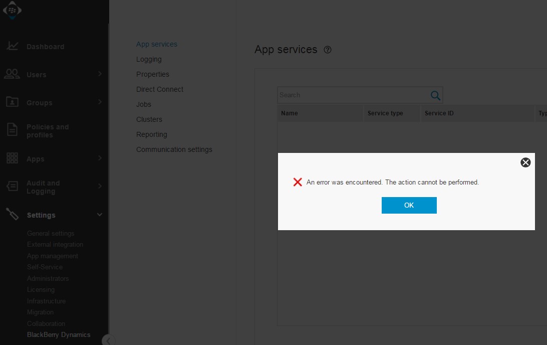 Also from the UEM instance in NJ, we cannot access anything under Settings -> Blackberry Dynamics when this issue occurs.