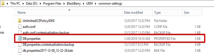 Upon reviewing the DB.properties file located at D:\Program Files\BlackBerry\UEM\common-settings on each UEM server (or C drive), we found: