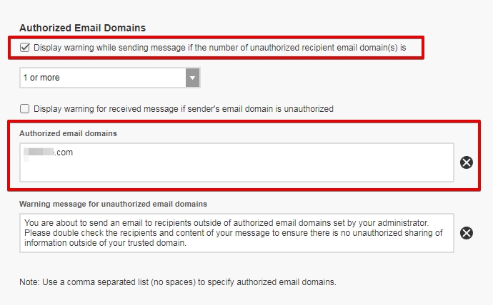 When you send an email to anywhere outside of the authorized domain, the recipient is shown in purple.