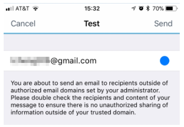 I mentioned earlier features that Enterprise Mobility Management (EMM) vendors can manage depends mainly on having access to applicable Apple API. For mail apps that vendors develop in-house, such as VMware Boxer or Blackberry Work, we can configure to have a warning prompt generated before the email is sent.