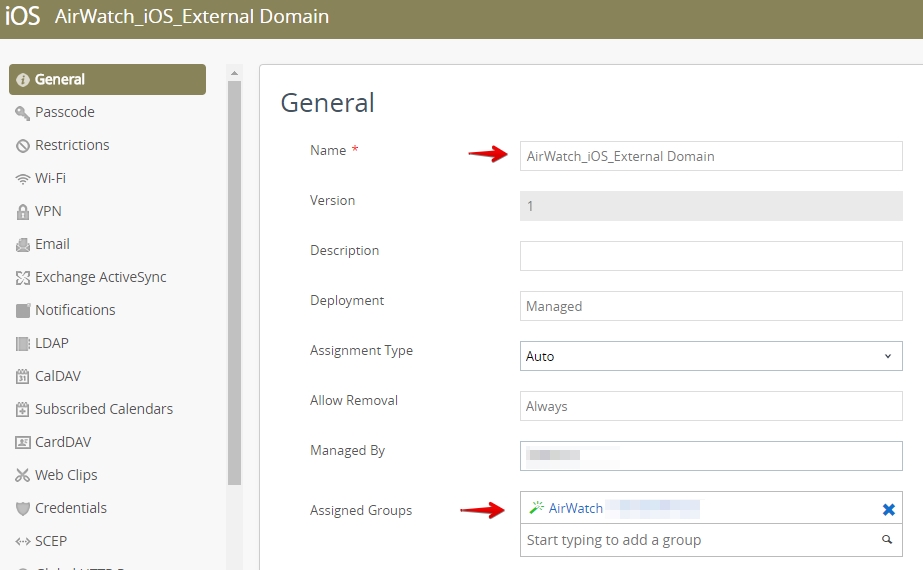 On the left side of the screen, select Managed Domains payload. Then fill in the field as shown. Just a quick reminder per VMware AirWatch, the best practice is to have only one payload per profile.