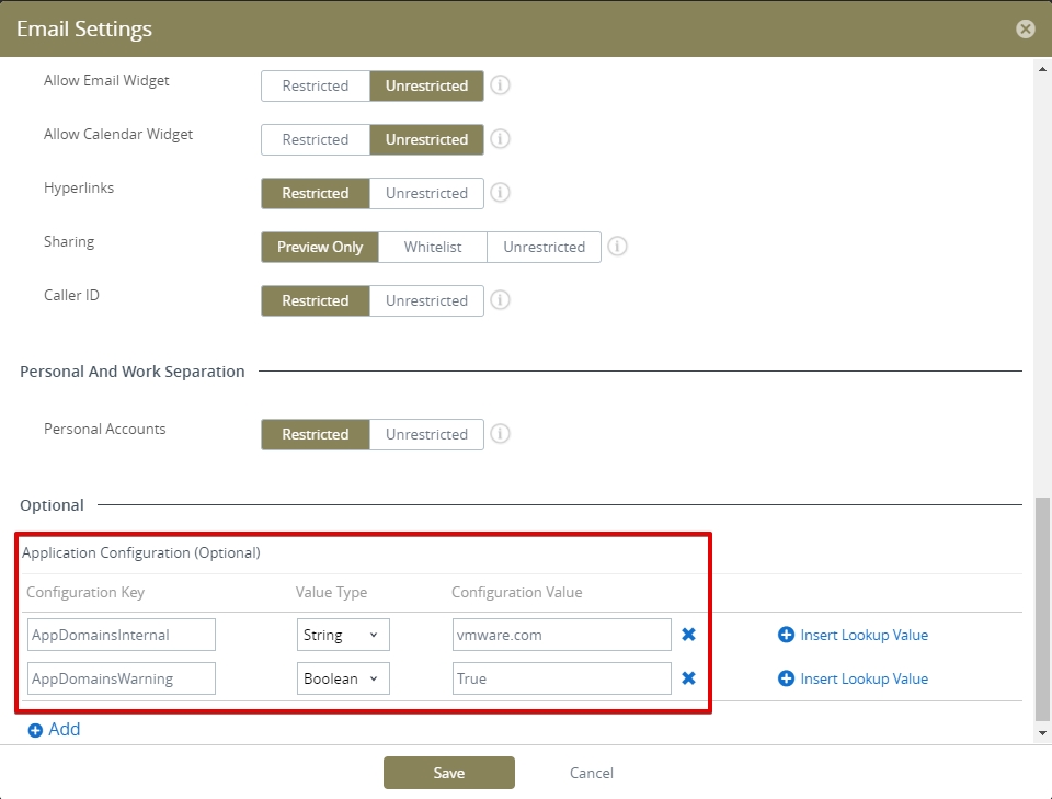 For VMware Boxer managed by VMware AirWatch, you will append the keys described below within Application Configuration section of the app under APPS & BOOKS -> Applications -> List View -> Public or Purchased. This feature was first introduced in April of 2018 per this link.