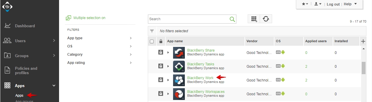 For Blackberry Work managed by Blackberry UEM, navigate to Apps -> Apps. Then click on Blackberry Work.