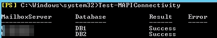 We will now move the database back to the server (Move-ActiveMailboxDatabase DB -ActivateOnServer Server). Afterward, test MAPI connectivity with this command: Test-MAPIConnectivity