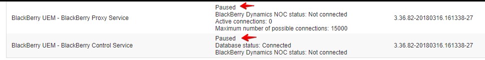- BlackBerry Control Service shows status “paused” in UEM Management Console