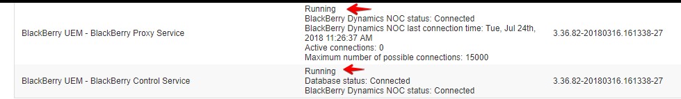 2018-07-23 16:10:12,967 INFO Cron0 com.good.gps.App – BES Status: {“paused”:true,”name”:”BlackBerry UEM – BlackBerry Proxy Service“,”ha”:{“scheme”:”active-active”,”state”:”active”},”health”:{“score”:80},”serviceID”:”GoodProxy”,”version”:”12.7.2.49″,”connections”:[{“connected”:true,”type”:”GC”,”dest”:”UEM_server,UEM_server”,”properties”:[{“name”:”lastConnectedTimeStamp”,”value”:”2018-07-23T16:10:12.604-04:00″}]},{“connected”:true,”type”:”session”,”properties”:[{“name”:”maxSession”,”value”:”15000″},{“name”:”activeSession”,”value”:”0″},{“name”:”totalSession”,”value”:”0″},{“name”:”idleSession”,”value”:”0″},{“name”:”noOfdirectConnectConnections”,”value”:”0″},{“name”:”noOfrelayConnections”,”value”:”0″},{“name”:”dest”,”value”:”gdrelay.good.com”},{“name”:”port”,”value”:”443″}]},{“connected”:false,”type”:”MDC”,”dest”:”gdentgw.good.com”,”properties”:[{“name”:”lastConnectedTimeStamp”,”value”:”Not Connected”},{“name”:”port”,”value”:”443″}]}]}