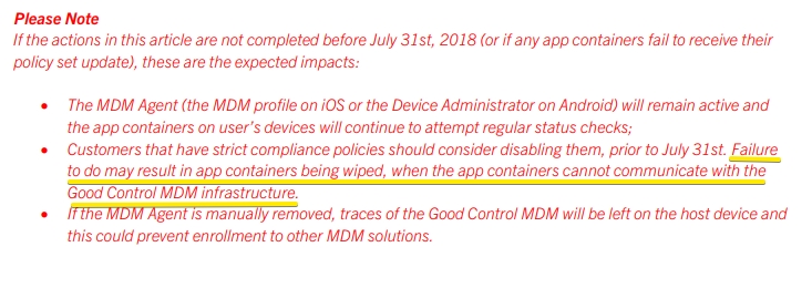 In early June of 2018, I received another email from Blackberry about End of Life for Good Control (GC) cloud which is used by one of my company’s clients. Per Blackberry, action must be taken before July 31, 2018. Otherwise, devices currently enrolled may be wiped during normal compliance check as the back-end infrastructure will no longer be present to validate.