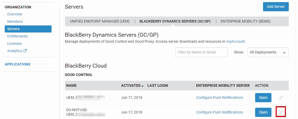 However, you will not be able to delete the associated Blackberry Cloud under BLACKBERRY DYNAMICS SERVERS (GC/GP) -> Blackberry Cloud. Per Blackberry technical support, this is because doing so would affect multiple customers as they are tied to the same database. The only alternative is to rename it by clicking on the pencil icon on the far right of the page.