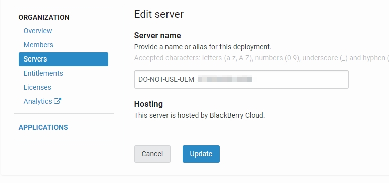 If you wish to delete the cloud instance you just created at a later time, go back to Servers. Under UNIFIED ENDPOINT MANAGER (UEM) -> Blackberry Cloud, identify the instance and move your mouse over to the garbage can icon (it appears dim by default). You should then be able to delete it.