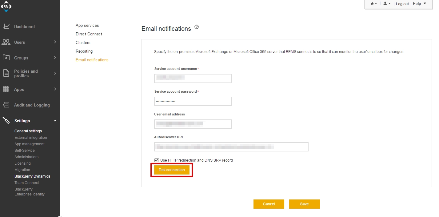 Once the impersonation permission is set, browse to Settings -> Blackberry Dynamics -> Email notifications. Then, fill in the info accordingly and click Test connection to confirm all is well. Don’t forget to click Save!