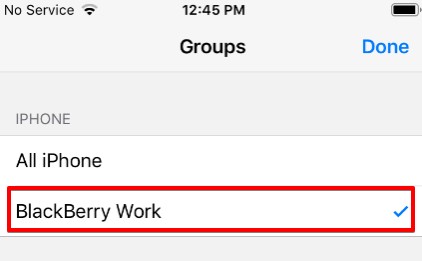 When you launch the native contact app again, you should see your Blackberry contacts. If you press on Groups on the upper left-hand corner, you will then see a new group named Blackberry Work.