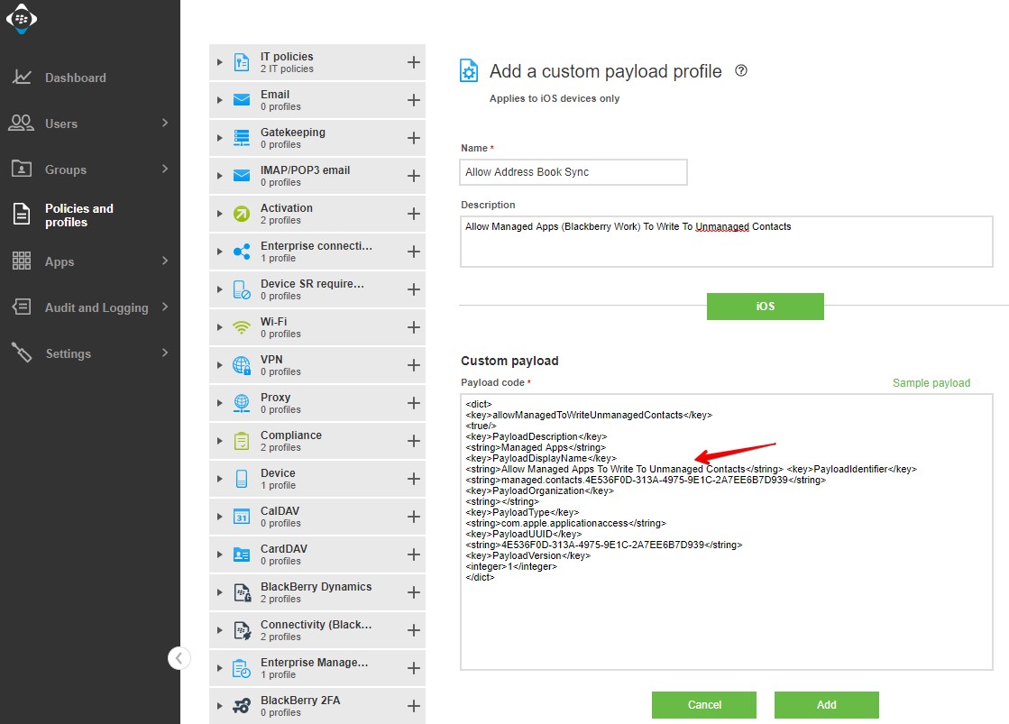 Here’s the sample XML code to allow syncing Blackberry contacts to the device.