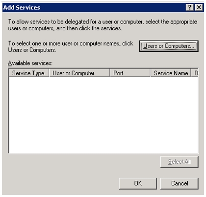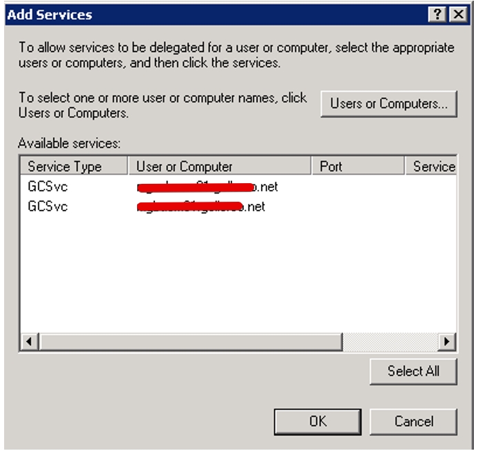 From the list of Available Services, you should see GCSvc with the FQDN of your Blackberry Control server that was created in Step 1 under the section “map the Blackberry Control service account to a service account principal name (SPN)” above. Click “Select All” and click “OK”