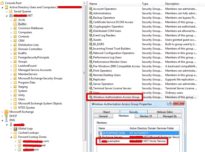 - In Active Directory Users and Computers mmc console, select “Builtin” from the list on the left, then right-click “Windows Authorization Access Group” and select “Properties”.