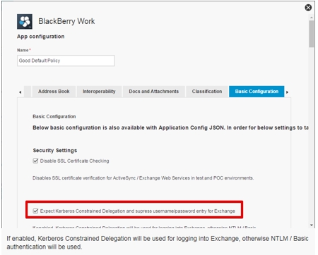 It is important to note that Kerberos authentication must be set for all Exchange ActiveSync (EAS) and Exchange Web Services (EWS) virtual directories in Exchange. Once this KCD is enabled on the BlackBerry Work client, it cannot fall back to Basic Authentication (NTLM).