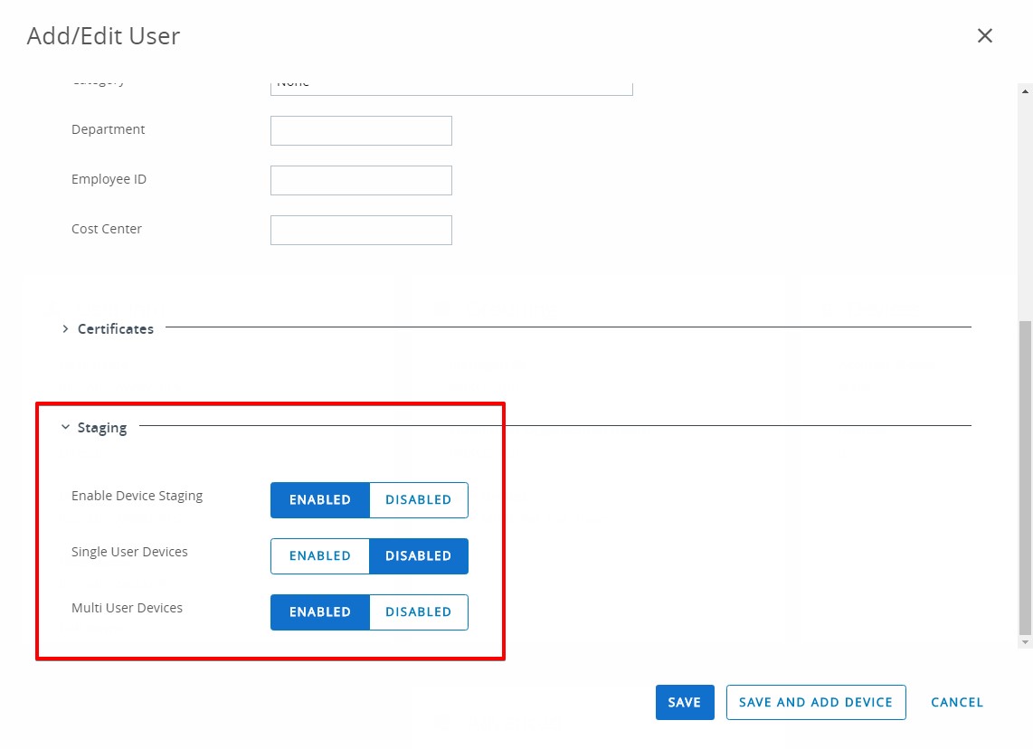 - Next to Enable Device Staging, click ENABLED which will then reveal additional setup options.