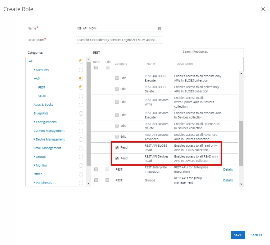 A restricted administrator role needs to be defined before creating an account for ISE to access the API in AirWatch. This particular role only requires access to REST API MDM and nothing else. Read permission should be sufficient for this integration. However, VMware support advised that if commands such as enterprise and device wipe are required by ISE, then Edit permission is also needed.