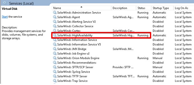 Here’s a look at the SolarWinds services on the secondary server. Those marked as Disabled will turn into Manual once it becomes the active server.
