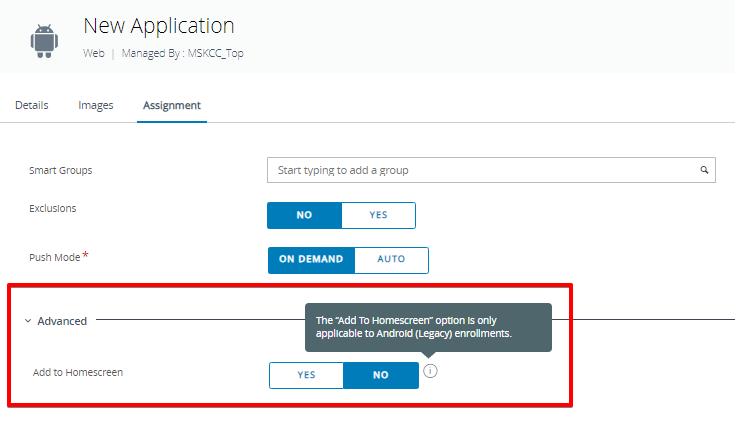 Notice the Advanced section under the Assignment tab is different here. Also, clicking YES doesn’t automatically add it to the home screen. Instead, the user will be prompted to complete the process.