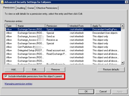 Number 6: Check off Include inheritable permissions from this object’s parent of user’s account in Active Directory