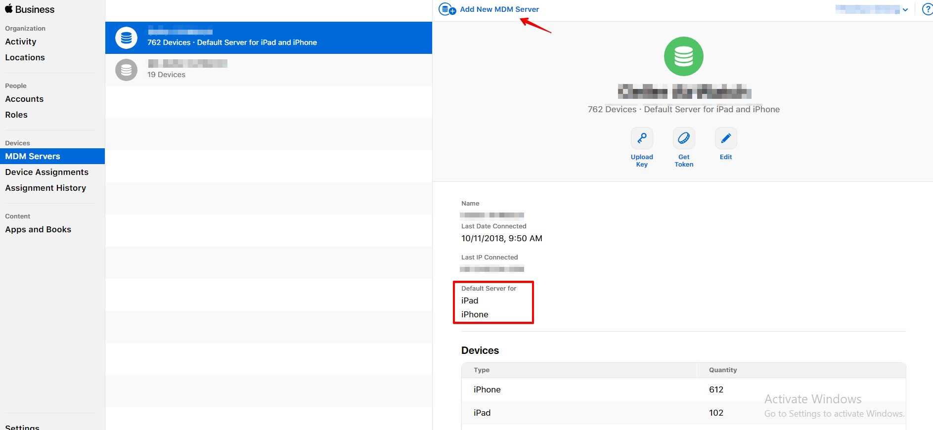 Under the Devices section, you will see the familiar subsections such as MDM Servers from the previous DEP portal. Here, you can review/edit/delete your existing MDM server or add a new MDM server. If you have more than one MDM servers, you can also set a particular one as the default server for specific device type (i.e. iPad, iPhone, etc.)