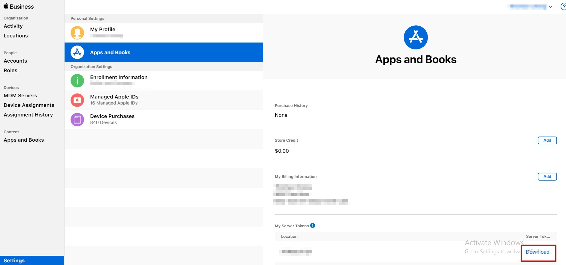 Last but not least, you will be able to configure various options that affect your entire organization in the Settings section. For instance, you can download the token to sync the VPP app with your MDM solution such as VMware Workspace ONE.