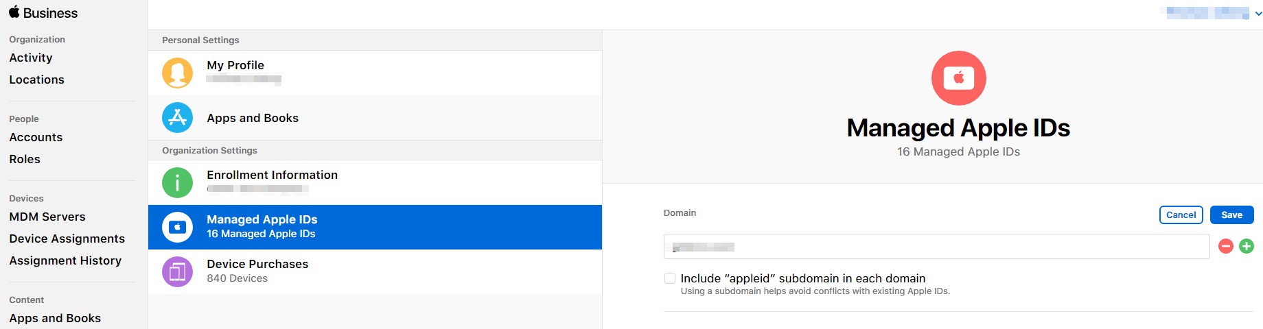 Under Managed Apple IDs, this is where you set the domain so that you only need to enter the username without specifying the domain each time you create a new account to access Apple Business Manager.