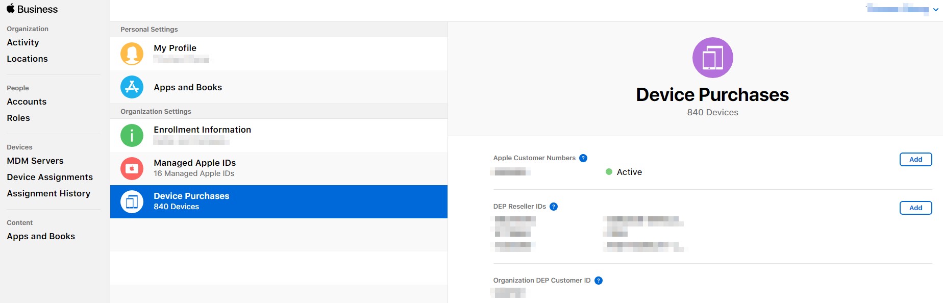 You may also update your Apple Customer Number as well as DEP Reseller IDs in Device Purchases.