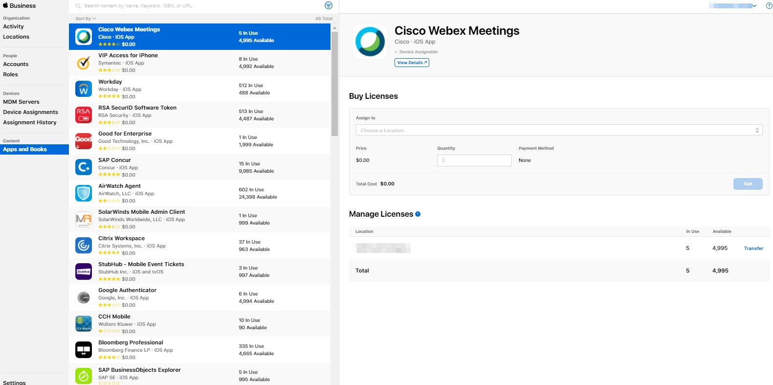 For VPP related tasks, they are in the Content section followed by Apps and Books. By default, you will see a list of purchased apps currently assigned to your MDM server(s). Click on an app from the list that will give you the option to either purchase additional licenses and/or transfer existing licenses from one location to another.